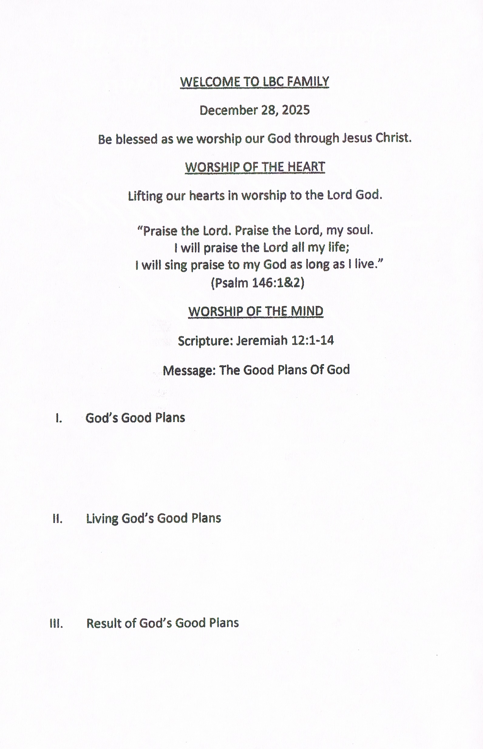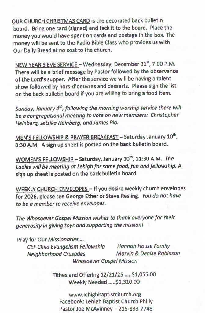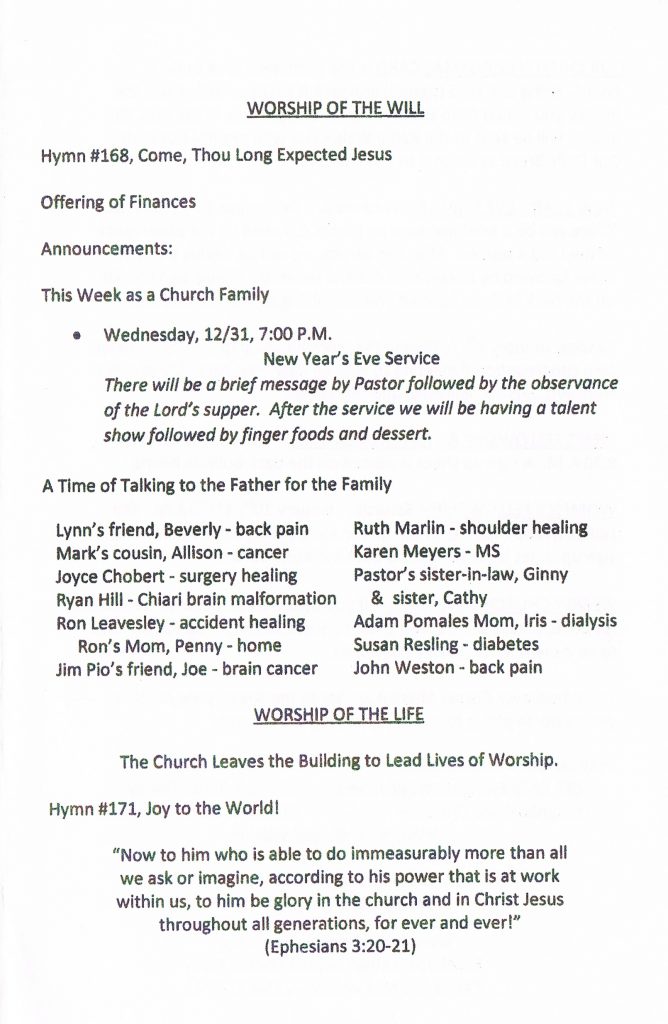 Wednesday, December 31st, at 7:00 PM. There will be a brief message by Pastor, followed by the observance of the Lord’s supper. After the service, we will be having a talent show followed by hors-d’oeuvres and desserts. Please sign the list on the back bulletin board if you are willing to bring a food item.
