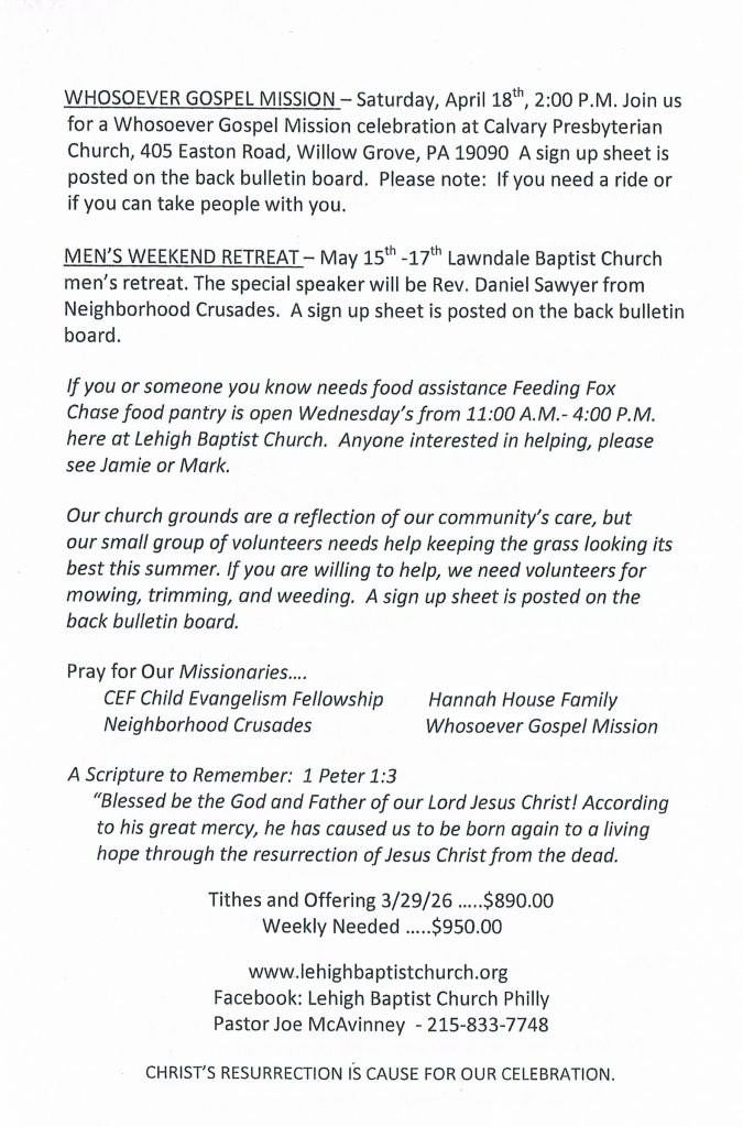 The Men’s Fellowship & Prayer Breakfast will be Saturday, April 11th at 8:30 AM. A sign-up sheet is posted on the back bulletin board. Come out for good food and great fellowship.