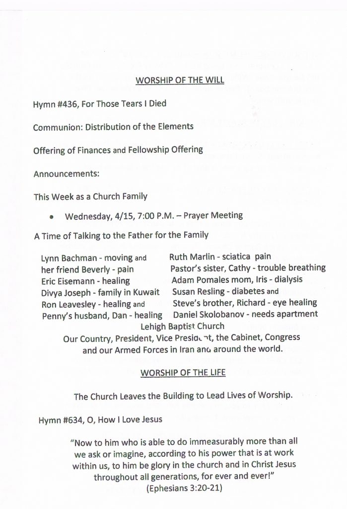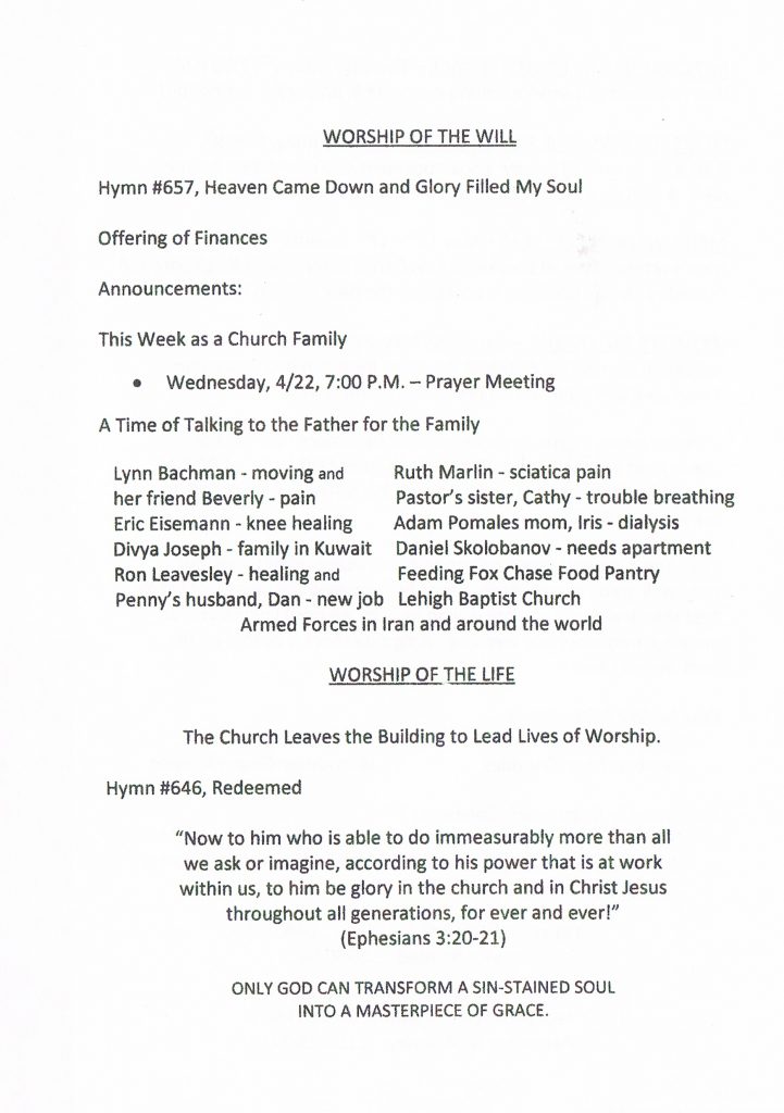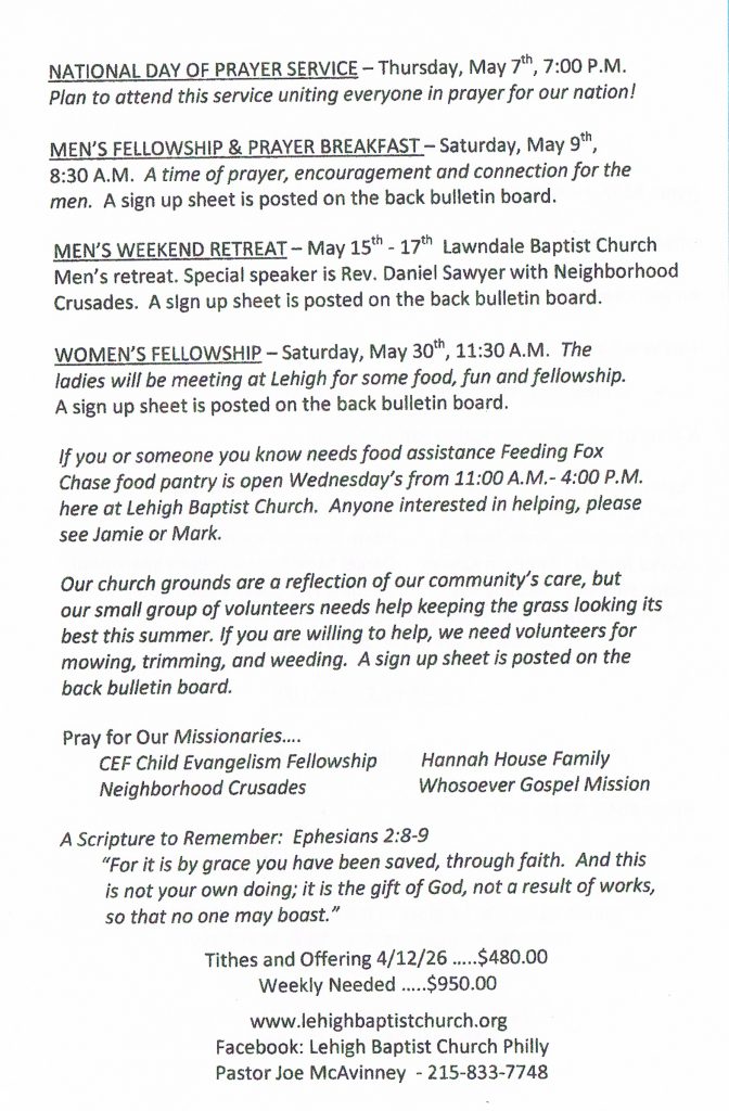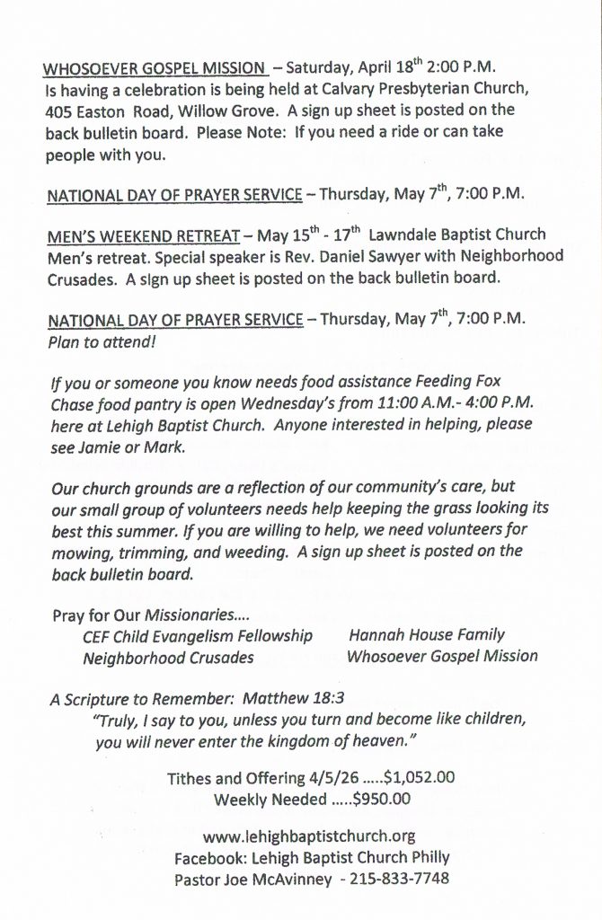 Saturday, April 18th, 2:00 P.M. Join us for a Whosoever Gospel Mission celebration at Calvary Presbyterian Church, 405 Easton Rd., Willow Grove 19090. A sign-up sheet is posted on the back bulletin board. Please note: If you need a ride or if you can take people with you.