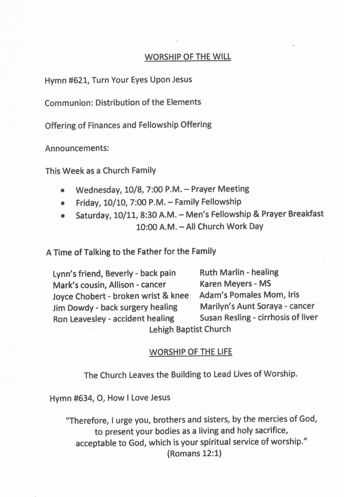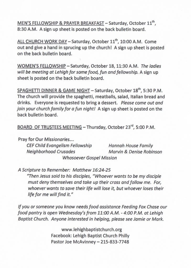 The Men’s Fellowship & Prayer Breakfast will be Saturday, October 11th at 8:30 AM. A sign-up sheet is posted on the back bulletin board. Come out for good food and great fellowship.