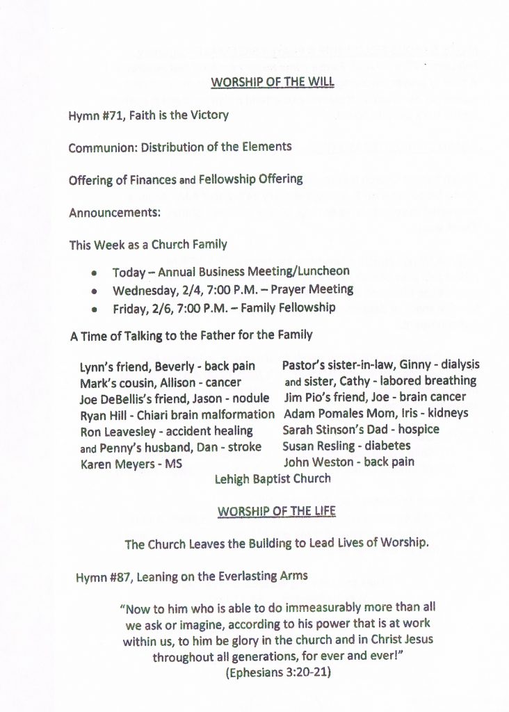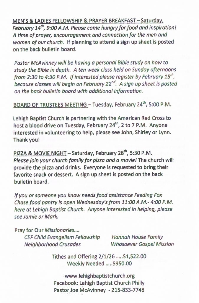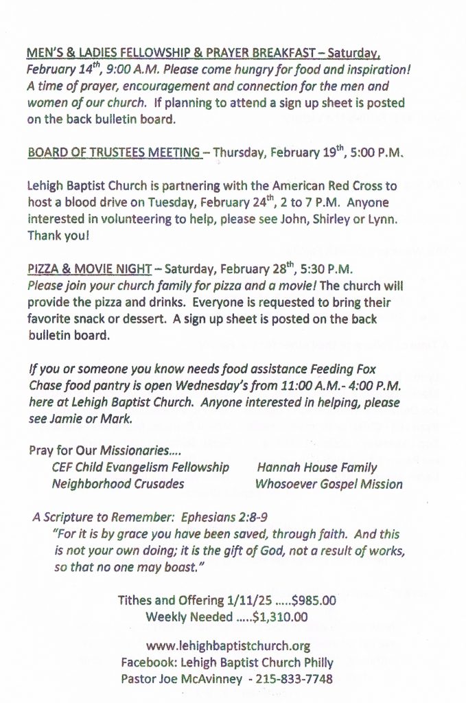 The Men’s Fellowship & Prayer Breakfast will be Saturday, February 14th at 9:00 AM. The women and men will meet to celebrate St. Valentine’s day. A sign-up sheet is posted on the back bulletin board. Come out for good food and great fellowship.