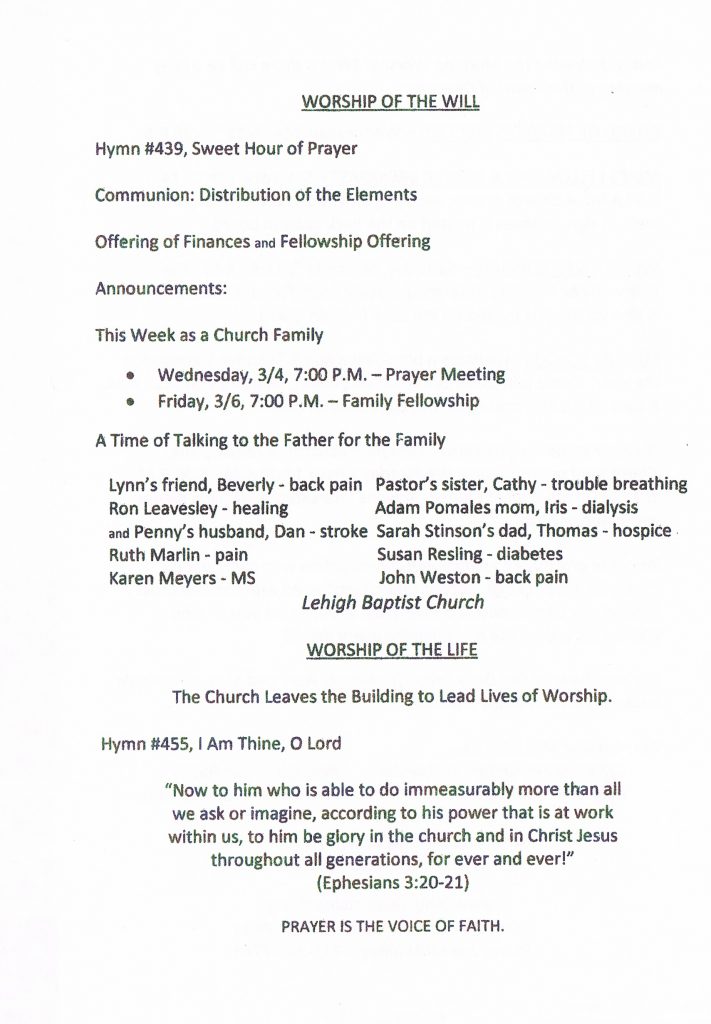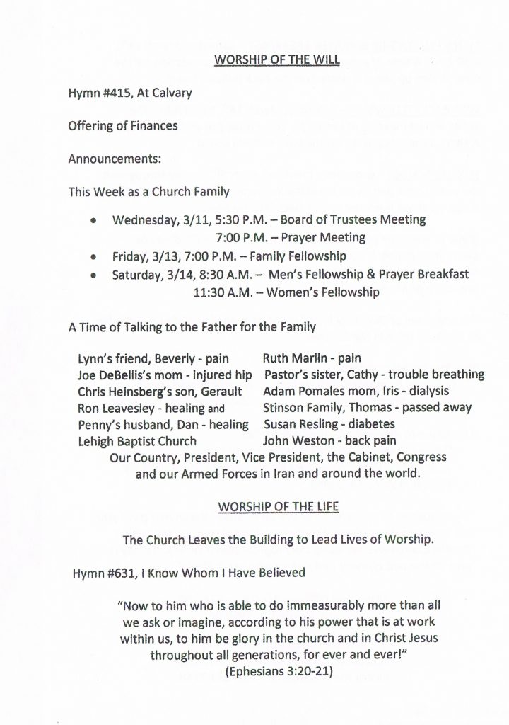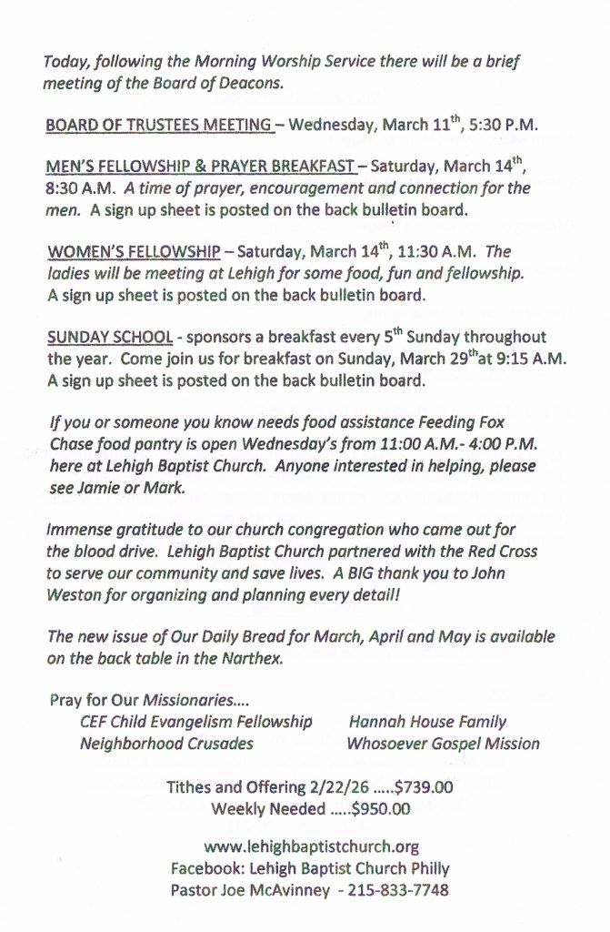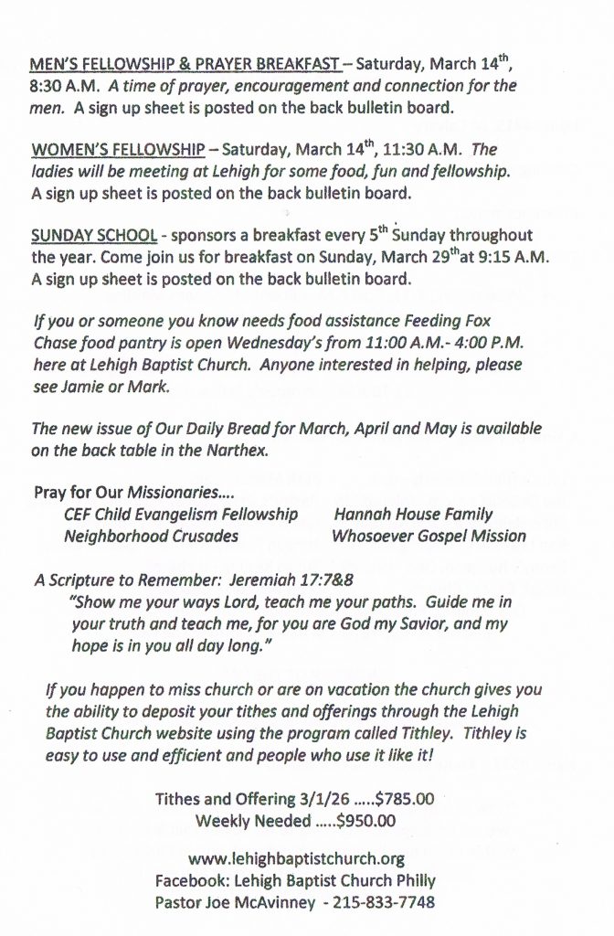 The Men’s Fellowship & Prayer Breakfast will be Saturday, March 14th at 8:30 AM. A sign-up sheet is posted on the back bulletin board. Come out for good food and great fellowship.
