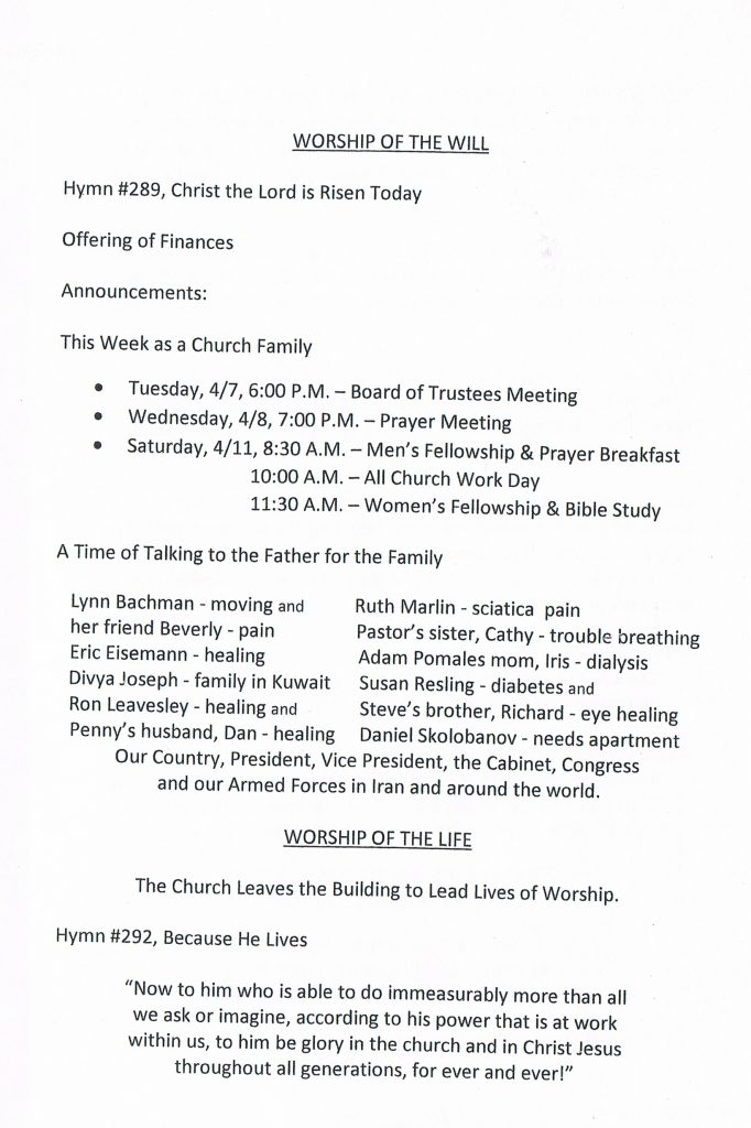Saturday April 11th, 10:00 AM. Come out and give a hand sprucing up the church! A sign-up sheet is posted on the back bulletin board. “Please try to come out and participate”