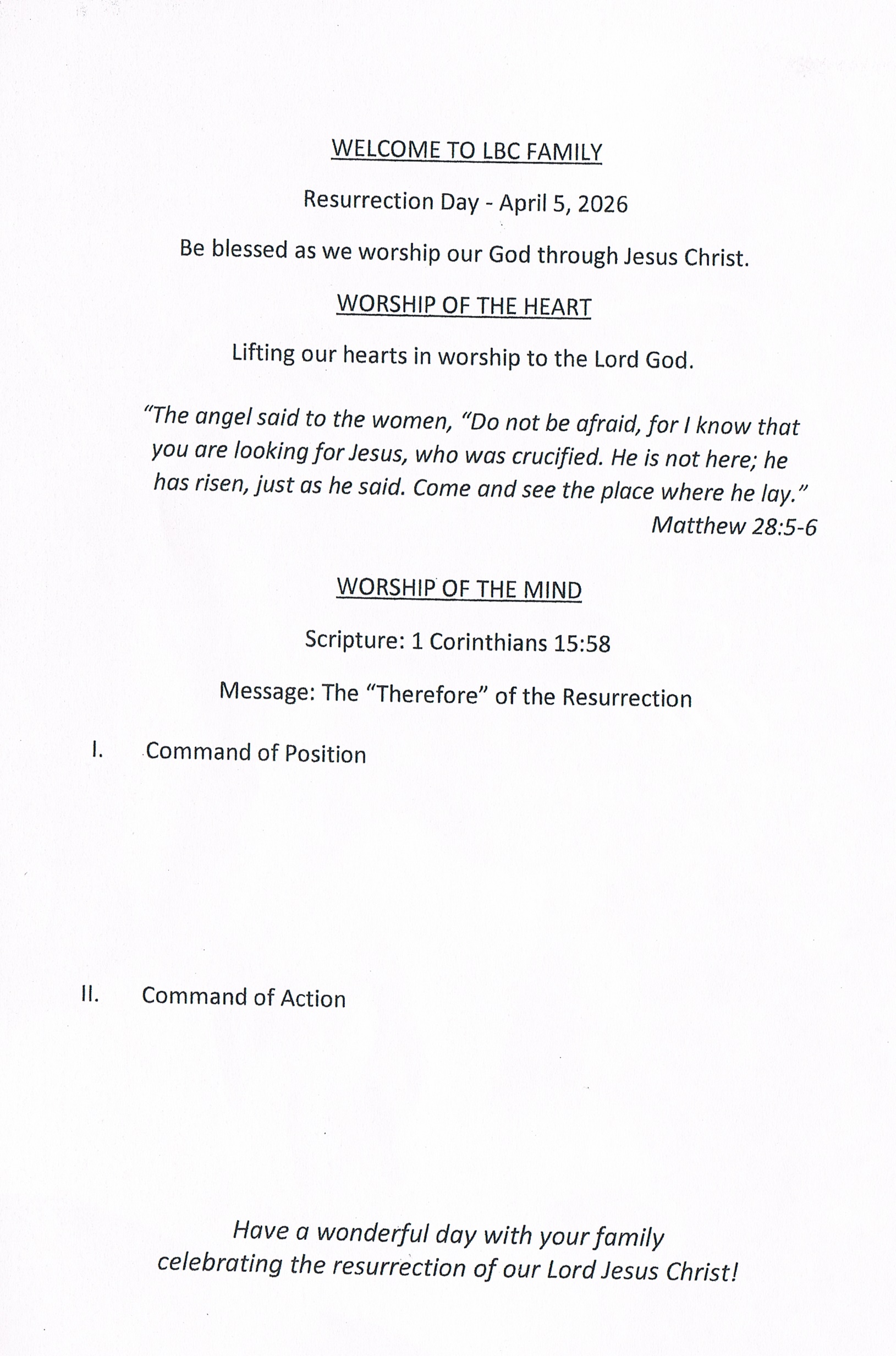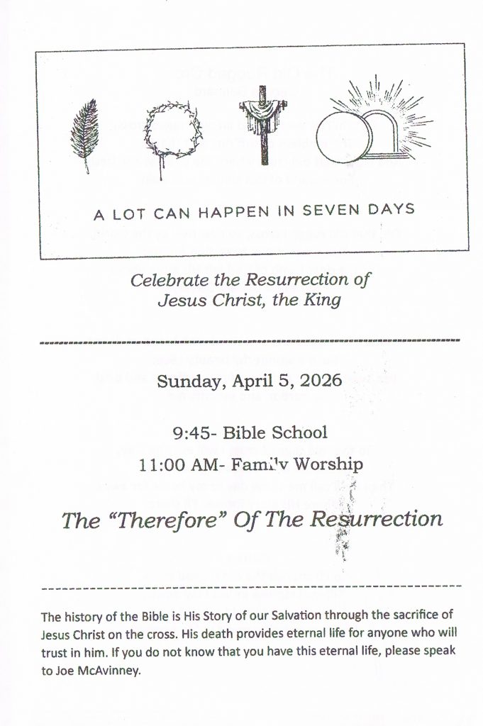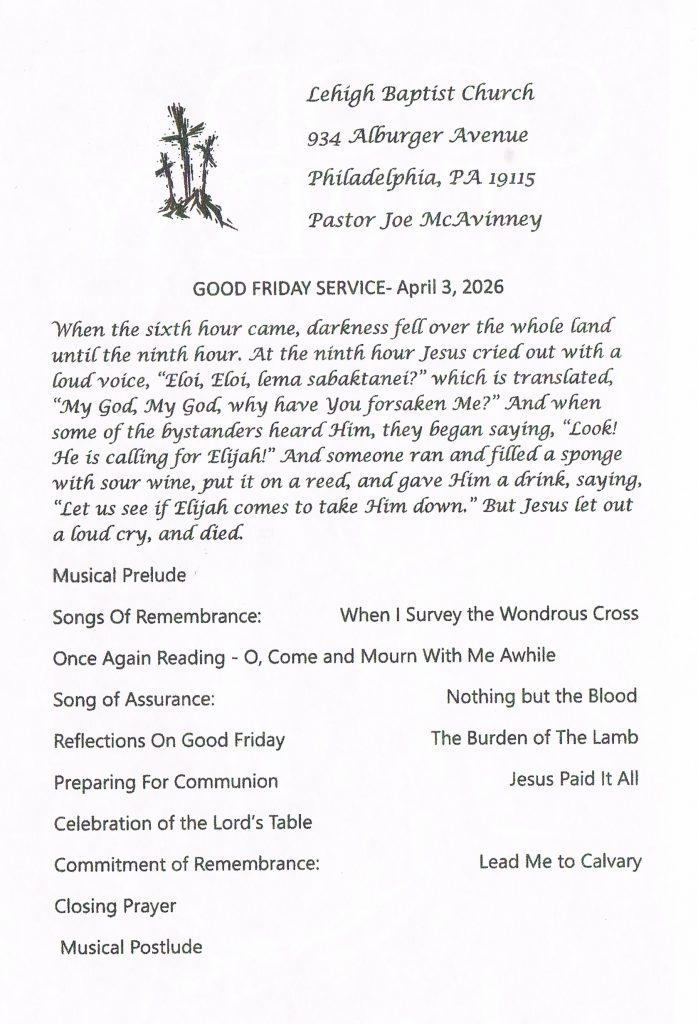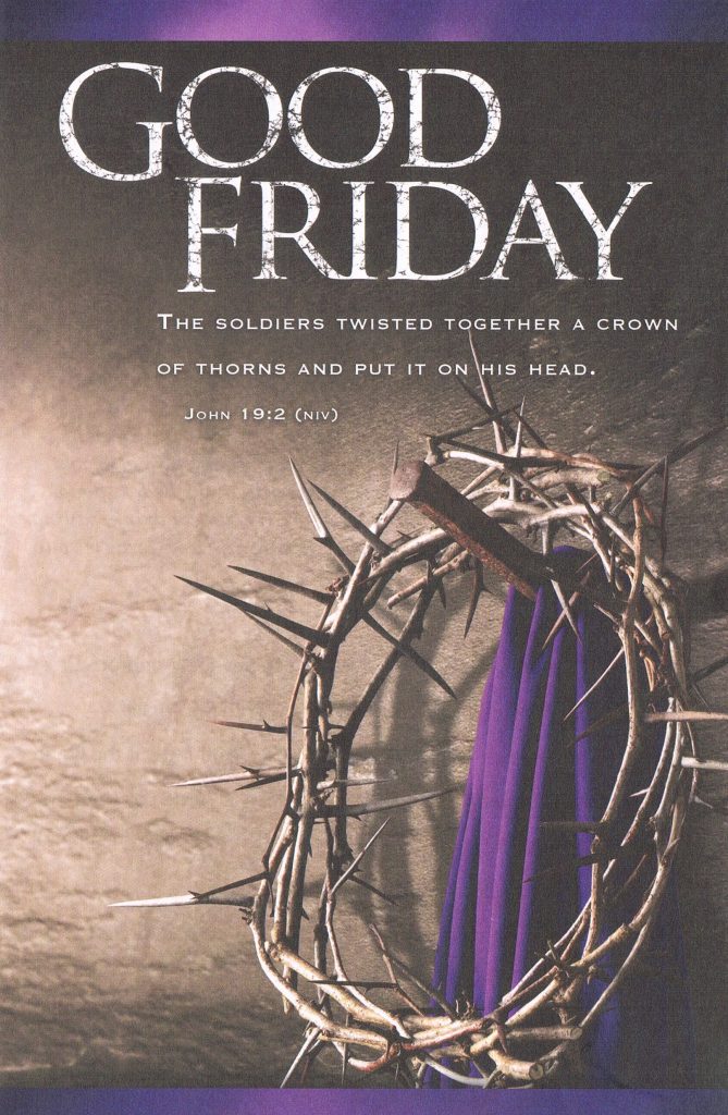 April 3rd, 7:00 PM. Communion service and a message from God’s word will focus on Christ’s sacrifice.
